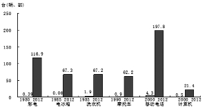 2012年,城乡居民消费结构明显优化。2012年,城镇居民恩格尔系数为36.2%,比1978年下降21.3个百分点;农村居民恩格尔系数为39.3%,下降28.4个百分点。居住条件极大改善。2012年,城镇居民人均住宅建筑面积32.9平方米,比1978年增加26.2平方米;农村居民人均住房面积37.1平方米,增加29.0平方米。消费领域不断拓展,物质生活极大丰富。彩电、电冰箱、空调、电话等耐用消费品逐步普及,汽车、电脑等高档耐用消费品拥有量大幅提高。