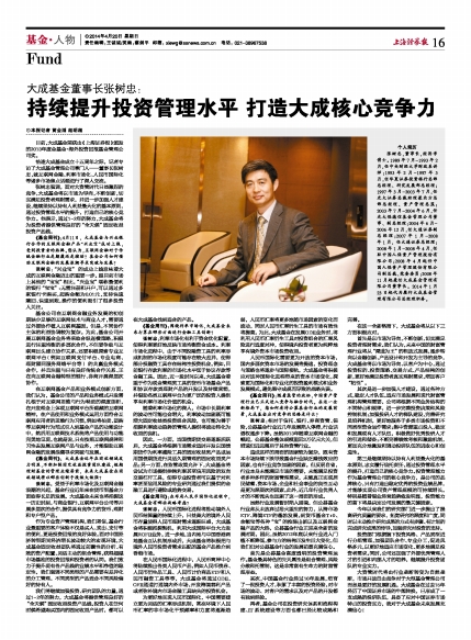 我们将继续加强投资、研究团队的力量,通过1-2年的努力,大成基金将提供管理良好的“全天候”固定收益投资产品线,投资人在任何时候希望购买国内的固定收益产品时,都可以在大成基金找到适合的产品。