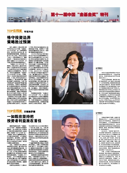 “金基金·TOP公司大奖”代表着《上海证券报》、基金研究机构和广大投资者对华宝兴业的信任,也是对华宝兴业作为基金管理人整体实力的最高评价。我们相信,华宝兴业能够获得“金基金?TOP公司大奖”并不是一个偶然,而是11年来坚守既定投资理念的结果。11年前,华宝兴业在成立之初就确立了“恪守投资边界,策略胜过预测”的投资理念。所谓“恪守投资边界”就是投资严格遵守基金合同规定;投资自己熟悉的股票,杜绝投资的随意性;坚持投资具有可预见持续增长的上市公司。所谓“策略胜过预测”就是说市场难以准确预测,策略比预测更重要;针对市场的不同特点,我们会制定相应有效的投资策略。秉承这一投资理念,华宝兴业旗下基金产品的整体业绩水平得以保持持续领先,并在主动型行业股票型基金和量化产品创新领域初步建立了业内领先的核心竞争力。在过去的11年里,华宝兴业为基金持有人发现和创造了价值,也获得了广大媒体朋友和基金持有人的认可,这是我们最值得欣慰的事情之一。