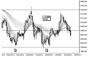 上证指数有可能形成一个新的长期盘整形态。4月的反弹到达2146点的高点,显示一个双重底或称为W底的趋势反转形态可能正在形成。2014年1月的点A和3月的点B附近区域构筑了双重底。
