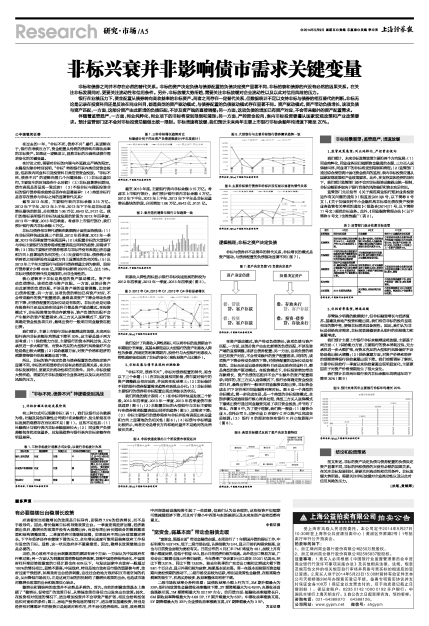 非标与债券相互替代逻辑在数据统计面前面临挑战:(1)在非标同样快速发展三个阶段,2012年四季度、2013 年一季度、2013 年四季度债市表现迥异;(2)未配置非标的大型银行与非标主要银行在债券需求配置表现出同样的趋势,即需求下降;(3)非标主要银行的债券需求与非标并没有表现出在总量和方向上显著地的负相关性;(4)兴业银行非标、债券统计表明两者之间同样没有总量和方向上显著地的负相关性;(5)以2012 年上半年大型银行与股份行债券增量比例为参照,股份行债券累计少增4936 亿,同期非标新增25978 亿,占比19%。非标对债券的替代仅是局部的,而非全局性的。