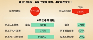 10家公司平均网上网下初始发行量分别为36%和64%。证监会统计数据显示,6家完成申购的公司网上认购倍数均高于150倍,其中网上认购倍数最低为176倍,最高达到515倍。这与年初发行的48家公司中仅有个别网上认购倍数超过150倍形成显著差异。