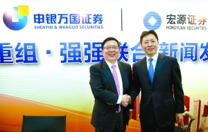 申银万国证券董事长李剑阁(图左)表示,本次重组由两家公司自愿发起,尽管属于汇金旗下两家券商整合,但和过去传统央企内部的整合有很大的差异。“这次重组的最大特点是市场化性质明显,重组以后的意义也非常重大。”