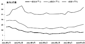 下面我们从地价、房屋库存/销售比例、商品房待售面积、房屋竣工、施工和新开工面积、商品房在建/销售等指标观察房地产的供给时滞和库存状况。从房地产市场自身的周期来看,在经历了2012年下半年和2013年的反弹之后,近几个月地价已经进入下行阶段,40个大中城市的成交土地楼面均价由去年末的4400元/平米左右下降到目前的2200元/平米左右,虽然该指标本身波动较大且代表性有限,但也能从一个侧面反映出整体地价的走弱。