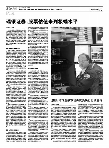 Mark Haefele指出,美联储主席耶伦似乎确信,尽管过去两年失业率下降了2%,但劳动力市场仍“相当疲软”。她将“一些部门的劳动力参与率下降视为一种隐藏的低迷或失业”。瑞银证券把耶伦有关估值“符合历史常态”的说法与她就美国劳动力市场仍“相当低迷”的观点结合起来,得出的结论是:在战术投资期限内,美联储可能会在宽松货币政策方面犯错,即使这种政策将导致中长期价格与工资通胀。