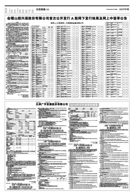 会稽山绍兴酒股份有限公司首次公开发行A股网下发行结果及网上中签率公告