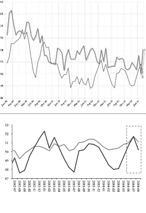 一方面,两大指标中就业指数均不佳。国家统计局数据中8月从业人员指数49.6%,比上月上升0.3个百分点;而汇丰服务业PMI就业人口虽较此前有所扩张,但增速较前两个月放慢。此外,稍早公布的制造业PMI中就业指数也继续维持在荣枯线下方。对此,招商证券在其研究报告中就指出,“近期汇丰PMI以及中采PMI就业指数的下滑反映经济合理区间下限再次遭遇挑战,未来或再次触发稳增长政策。”