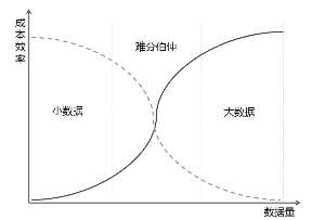 当然,在财力、人力和物力运行的情况下,能够兼顾大数据和小数据的分析,做到数据的优势互补,则能够创造更多的利润。图2给出了大数据和小数据在数据量方面及效率对比图,可以看出,在中间重叠的区域,大数据和小数据的分析功效难分伯仲。如果能做到大数据和小数据的优势互补,对企业数据的分析是最好的选择。