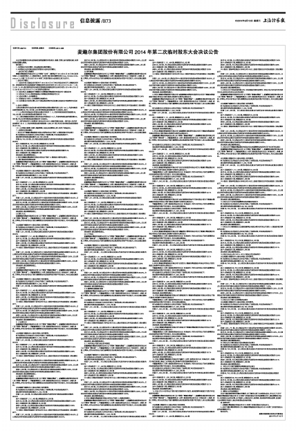 麦趣尔集团股份有限公司2014年第二次临时股东大会决议公告
