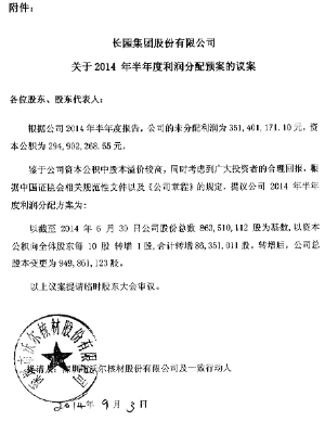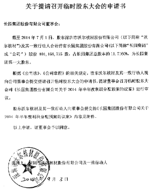 长园集团股份有限公司(以下简称“公司”)于2014年9月5日收到了深圳市沃尔核材股份有限公司《关于提请召开临时股东大会的申请书》,提请公司董事会召集临时股东大会审议《长园集团股份有限公司关于2014年半年度利润分配预案的议案》。利润分配预案的主要内容:以截至 2014 年 6 月 30 日公司股份总数863,510,112股为基数,以资本公积向全体股东每 10 股 转增 1股,合计转增86,351,011股。转增后,公司总股本变更为949,861,123股。