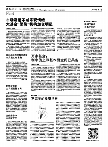 基金持股仓位测算的样本是全部已披露2014年2季报的开放式主动型股票基金和混合基金,采用截至9月19日的数据,基金整体持股仓位83.5%,与上一期测算结果相比加仓2.1个百分点,剔除各类资产市值波动对基金仓位的影响,主动加仓2.2个百分点。其中,股票型基金整体仓位89.7%,上升2.0个百分点,主动加仓2.1个百分点,混合型基金整体仓位75.2%,上升2.2个百分点,主动加仓2.3个百分点。