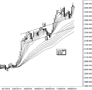 飓风旗形形态是一个非常强势的上升趋势持续形态。上倾的飓风旗形形态在非常快速的上涨行为结束时形成。指数从2049点上涨到2226点,形成形态开始的“旗杆”部分。旗杆上的“旗帜”限制在两条平行的上升的趋势线之间。上轨趋势线A连接指数活动的高点。下轨的趋势线B是旗形形态的下边缘。