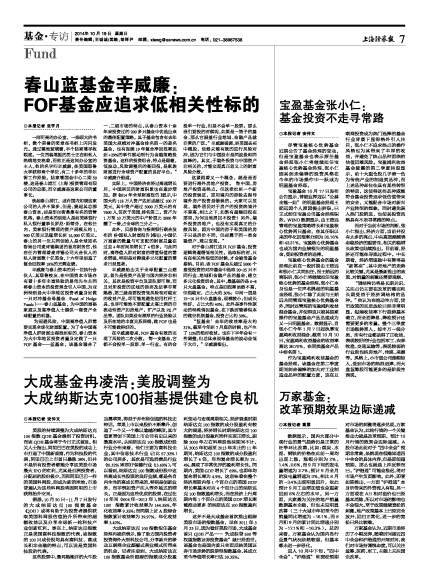 对于春山浦江这只FOF基金,投资逻辑将遵循低相关性。选取标的时,只有在相关性很低的时候,才会被母基金接纳。目前,该FOF基金从超过5000个接受投资的对冲基金中选取20~25只不同行业、地域和金融产品的基金,建立多元化投资组合。其中,最基础的是6~8只大盘基金。特点是回报率虽然不高,但很稳定,占比大约30%;中间一层是15~16只中小盘基金,规模较小,但成长性好,占比大约40%;此外是事件性驱动的特殊情况基金,在下跌时能够保本的做空机制基金,投资占比约30%。