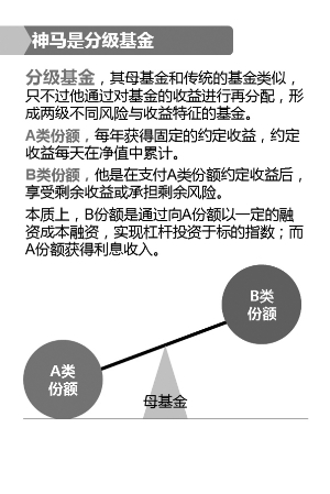 分级基金具有三种份额,分别是母份额、A份额(稳健份额)、B份额(激进份额)。其母基金和传统的基金类似,但分级基金通过对母基金的收益的再分配,形成两级不同风险与收益特征的基金:一个是A类份额,每年获得固定的约定收益,约定收益每天在净值中累计;一个是B类份额,它是在支付A类份额约定收益后,享受剩余收益或承担剩余风险。本质上,B份额是通过向A份额以一定的融资成本融资,实现杠杆投资于标的指数;而A份额获得利息收入。因此,分级基金为三类不同类型的投资者均提供了合适的交易工具,低风险的固定收益投资者可以买入A份额,稳健的权益投资者可以申购母基金,而激进的权益类投资者可以买入B份额。