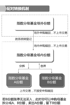 在了解了分级基金的运作机制和子份额之后,我们应该了解一下配对转换机制。与传统的基金不同的是,A份额、B份额均不能以净值申购赎回,但分级基金设置了配对转换机制,即投资者申购母基金可以拆分成A、B份额,也可以将A、B份额按照一定的比例合并成母基金实现赎回。对于一个A、B份额配比为1:1的分级基金,1份A份额和1份B份额可以合并成2份母基金,而2份母基金可以拆分成1份A份额和1份B份额。