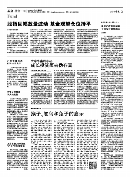 上周股指巨幅放量波动,市场高位大幅震荡。上证综指上涨0.91%、深成指上涨4.48%、沪深300上涨2.53%、中小板指下跌1.49%、创业板指下跌2.11%。从行业上看,钢铁、国防军工、交通运输涨幅居前,计算机、采掘、电子涨幅滞后。从基金表现看,指数型基金领涨,涨幅为1.37%,混合型基金下跌1.12%,主动股票型下跌1.44%。