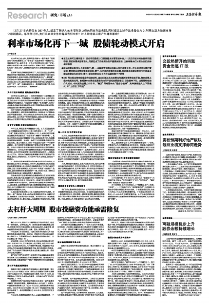 1、资金追捧地产板块。由于货币政策逐渐显现宽松迹象,而多个二、三线城市地方政府取消限购、限贷政策,成为地产板块上涨的主要动力,11月和12月数据显示,主要城市房地产市场成交量继续环比改善,呈现出淡季不淡特点,地产股尤其是一线低估值地产股,仍有一定想象空间。从12月29日涨停的保利地产龙虎榜席位可以看到,前五大买入席位出现了1家机构专用席位,1家沪港通专用席位和中信证券深圳总部,显示大资金对于一线低估值地产股中线依然看好,逢低仍可关注,相关概念股还有首开股份、天地源、招商地产、金融街等。