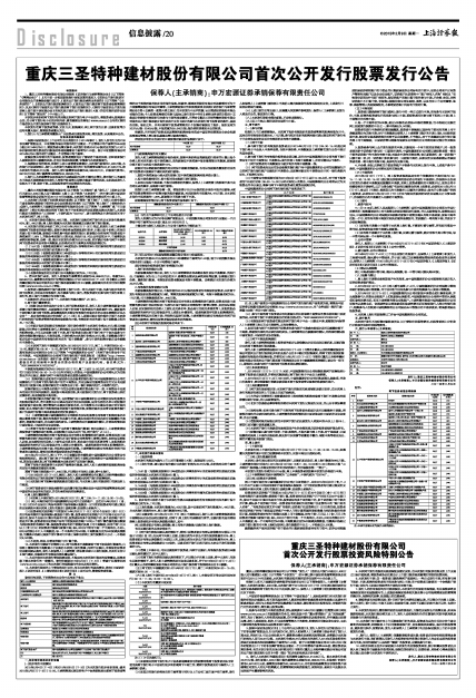 3、按照中国证监会制定的《上市公司行业分类指引》,发行人所在行业为制造业(C)下的非金属矿物制品业,行业代码为C30。发行人和保荐人(主承销商)综合考虑了发行人基本面、所处行业、可比公司估值水平、募集资金需求及承销风险等因素,协商确定本次发行价格为人民币20.37元/股。本次发行价格20.37元/股对应的发行人2013年扣除非经常性损益前后孰低的净利润摊薄后市盈率为21.22倍,低于中证指数有限公司2015年2月5日发布的制造业(C)下的非金属矿物制品业最近一个月平均静态市盈率24.65倍,请投资者决策时参考。有关本次定价的具体分析请见同日刊登的《重庆三圣特种建材股份有限公司首次公开发行股票发行公告》中第一部分“初步询价结果及定价依据”。