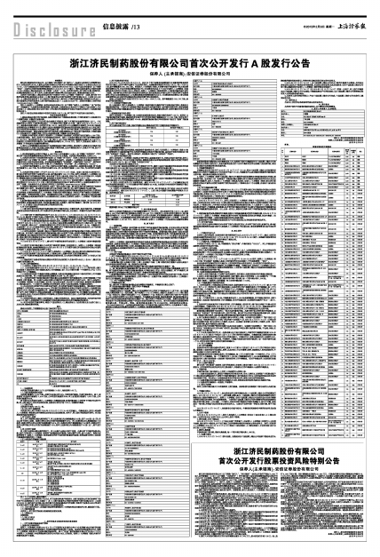 浙江济民制药股份有限公司首次公开发行A股发行公告