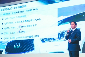 2014年,英菲尼迪在中国销量继续领跑豪华车,其在华销量首次突破3万辆,同比增长76%。2015年,英菲尼迪希望继续领跑豪华车细分市场。