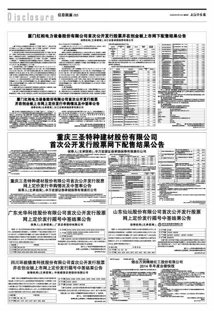 厦门红相电力设备股份有限公司(以下简称“发行人”、“红相电力”)于2015年2月10日利用深圳证券交易所交易系统网上定价初始发行“红相电力”A股886.80万股。根据《厦门红相电力设备股份有限公司首次公开发行股票并在创业板上市发行公告》公布的网上网下回拨机制及当日总体申购情况,发行人和保荐机构(主承销商)长江证券承销保荐有限公司(以下简称“保荐机构(主承销商)”)决定启动回拨机制,从网下向网上回拨。回拨后,网下最终发行数量为221.70万股,占本次发行数量的10%,网上最终发行数量为1,995.30万股,占本次发行数量的90%。