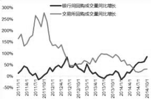 近年来,质押式回购市场活跃度不断提高,银行间和交易所市场成交量交替上升。目前银行间和交易所每天成交总量超过万亿,2014年平均每月日均成交量达到1.16万亿,较2013年增长33%;而10月日均回购成交量接近1.5万亿,较2013年同期增长69%。交易所成交量也有较快增长,2010年初交易所日均回购量不超过200亿元,至2014年10月已经达到接近4000亿元。从市场增速来看,交易所市场增速较快,在2011年和2013年的成交量增速分别超过150%和50%,银行间市场在2012年和2014年成交量有较大增幅,特别是2014年下半年以来同比增速超过50%。(见图1)