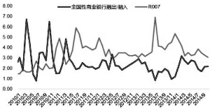由于全国性商业银行在质押式回购中融入资金和融出资金占比均较大,因此全国性商业银行资金融出与融入之比对市场资金面的波动有较为直接的影响。2011年以前,这一比率波动较大,2011年以后,这一比率中枢在2%附近波动,当融出/融入比率下降时,市场利率明显走高;当比率上升时,利率有所回落。(见图5)