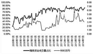 2013年6月和12月钱荒时,资金利率飙升。与此同时,隔夜回购成交量占比急剧下降;2014年以来,资金利率维持在稳定较低位置,隔夜成交占比也有所回升。
