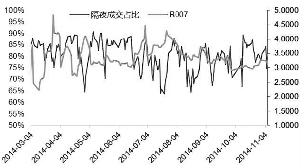 以2014年为例,下半年隔夜资金成交占比较上半年总体小幅回落,且由于下半年每个月IPO对资金面形成一定扰动,使得隔夜占比在月中的波动十分明显,即使央行投放资金或通过公开市场维稳资金利率,也难改市场交易结构发生的微妙变化。(见图8)