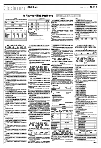 深圳王子新材料股份有限公司(以下简称“公司”)第二届董事会第十七次会议决定召开2014年年度股东大会,会议召开时间定于2015年5月13日,具体事项如下: