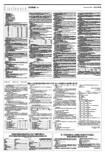 福建三元达通讯股份有限公司关于召开2014年度股东大会的提示性公告