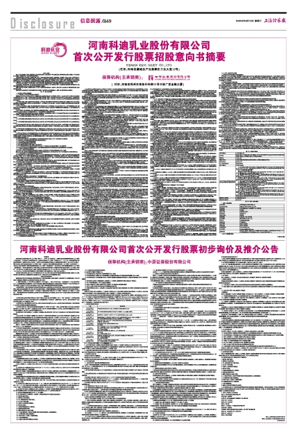 河南科迪乳业股份有限公司首次公开发行股票初步询价及推介公告