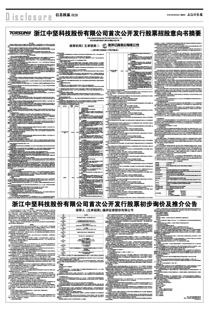 浙江中坚科技股份有限公司首次公开发行股票初步询价及推介公告