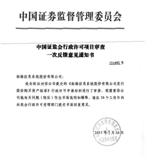 拓维信息系统股份有限公司(以下简称“公司”)于2015年07月17日收到中 国证券监督管理委员会(以下简称“中国证监会”)出具的《中国证监会行政许可项目审查一次反馈意见通知书》(151692号),中国证监会依法对公司提交的《公司发行股份购买资产核准》行政许可申请材料进行了审查,现需要公司就有关问题(附后)作出书面说明和解释,并在 30 个工作日内向中国证监会行政许可受理部门提交书面回复意见。