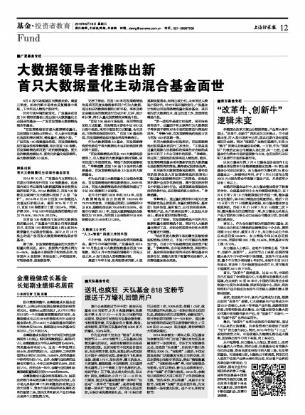 当百发100指数向市场证明大数据选股的魅力时,广发基金与百度公司再次超越自己,在百发100模型的基础上推出系列大数据量化主动混合型基金。其中,8月18日推出的是广发百发大数据策略精选混合型基金。