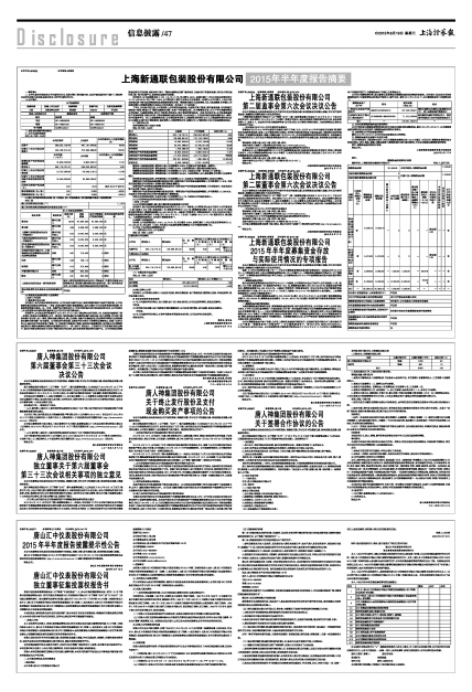 根据《上市公司监管指引第2号——上市公司募集资金管理和使用的监管要求》(证监会公告[2012]44号)、《上海证券交易所上市公司募集资金管理办法(2013年修订)》、上海新通联包装股份有限公司(以下简称“公司”)《募集资金使用管理制度》等有关规定,公司董事会将公司2015半年度募集资金存放与实际使用情况专项报告如下: