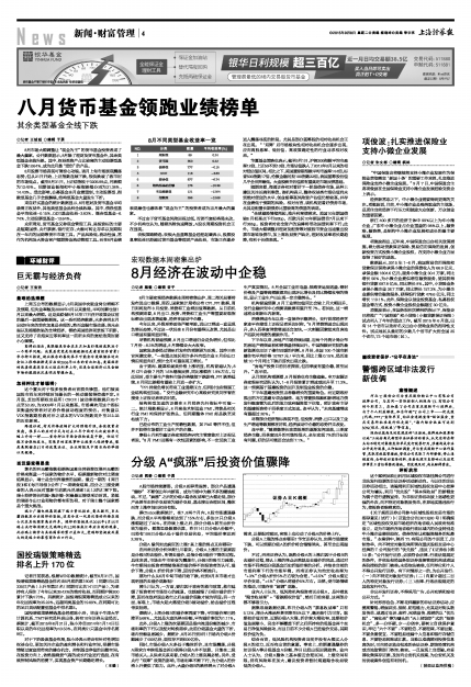 八月货币基金领跑业绩榜单 其余类型基金全线下跌