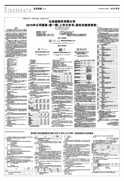 洛阳栾川钼业集团股份有限公司关于召开2015年第一次临时股东大会的通知