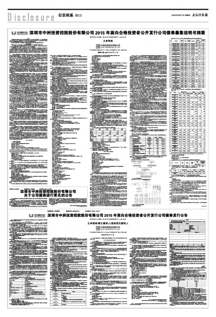 14、本公告仅对本期债券发行的有关事宜进行说明,不构成针对本期债券的任何投资建议。投资者欲详细了解本期债券情况,请仔细阅读《深圳市中洲投资控股股份有限公司2015年面向合格投资者公开发行公司债券募集说明书》,该募集说明书摘要已刊登在2015年9月17日的《中国证券报》、《证券时报》、《上海证券报》上。有关本次发行的相关资料,投资者亦可到深圳证券交易所网站(http://www.szse.com.cn)和巨潮资讯网(http://www.cninfo.com.cn)查询。