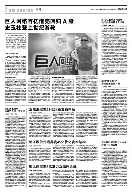 巨人网络回归A股方案出炉。世纪游轮拟以29.58元/股的发行价格,向巨人网络的全体股东非公开发行4.43亿股,作价131亿元购买巨人网络100%股权,由此巨人网络借壳上市。巨人网络股东承诺,2016年、2017年和2018年扣非后净利润将不低于10亿元、12亿元及15亿元。