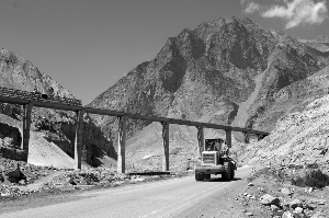 在奥依塔克镇——布伦口段,记者一路看到了凿山开洞、遇河架桥的施工场面,各种工程车紧张作业着。“建中巴经济走廊竖丝路高原丰碑”,北新路桥的蓝底白字宣传牌横跨在狭长山道上,显得格外醒目。它提醒着人们,建设者们正在争分夺秒,以高标准、严要求,打造中巴经济走廊上的国际交通大动脉。该工程预计2016年10月建成通车。