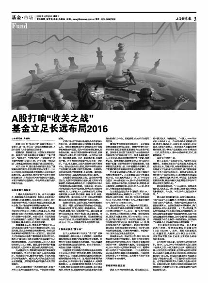 对于2016年,部分基金投研团队做出了谨慎偏乐观的预判:在经济转型的大背景下,上市公司也在积极地通过兼并收购等方式寻求新的发展方向,基金经理们倾向于给予那些符合经济发展方向、具有成长空间的行业和公司溢价,不囿于传统的估值指标,中长期坚定看好成长和新兴行业。