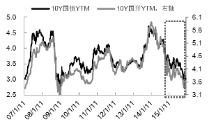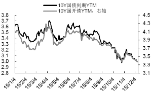 第一,2015年10月中叶以来,10Y 国债和 10Y 国开触底后金融危机时期新低,区间分别为(2.7%,3%)和(3.1%,3.4%),被认为充分反映基本面对债市的定价逻辑,我们将这一段债市利率作为 2016 年债市利率预测的上限 ,即 2016 年10Y 国债和 10Y 国开将分别下探3%和3.4%。