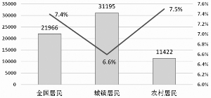 据国家统计局统计,2001—2014年,GDP年均增长9.8%,城镇和农村居民人均收入分别增长9.2%和7.9%,增幅差距分别为0.6和1.9个百分点。2015年,全国居民人均可支配收入21966元,比上年名义增长8.9%,扣除价格因素实际增长7.4%,快于GDP0.5个百分点。居民收入相对于GDP、物价“跑”得更快,意味着居民的购买力有所增强,将为消费持续增长提供有力保障。