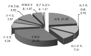 截至2015年底,中国债券市场中各类型债券的占比方面,利率债仍然占绝大部分,其中国债占比达21.25%,金融债(含政策性金融债)占比达29.08%,地方政府债占比达9.78%。信用债方面,企业债占比为6.25%,公司债占比为3.97%,短融占比为4.97%,中票占比为8.52%。