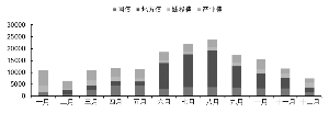 综合考虑发行到付时序、政策背景、经济环境、宏观指标、券种及期限置换等因素,建立回归模型,并基于债市风向进行动态调整。(1)以2015年年底债券存量结构情况预估2016年债券总偿还量。(2)对发行到付时序进行回归,在R方较大的前提下得到系列宏观指标与不同券种的净融资额的回归关系,基于政策调控及经济环境对GDP增速、财政赤字率、基建增速、工业增加值进行预估假设,从回归关系得到净融资额预测。(3)利用偿还量和净融资需求,以总发行量=总偿还量+净融资额的关系估计发行情况。得到如下发行结构情况:就发行节奏预测来看,我们利用2011年至2015年的月度发行数据进行统计,测算出每月发行量占全年发行量的平均占比,以此对2016年的发行节奏进行预测。并将其中2016年1月和2月份的发行预测量替换为实际发行数据。特别要指出的是,针对仅从2015年下半年开始放量的地方债,我们预计其2016年上半年将小幅匀速置换,下半年发行节奏与2015年类似。(见图1)。