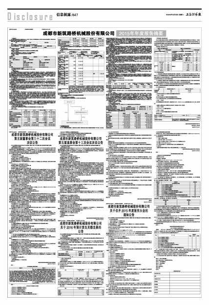 成都市新筑路桥机械股份有限公司(以下简称“公司”)于2016年3月28日在公司办公楼324会议室以现场会议形式召开了第五届董事会第三十二次会议,会议通知已于2016年3月16日以电话和邮件形式发出。本次会议由公司董事长黄志明先生召集与主持,应到董事9名,实到8名,独立董事王砾先生因出差无法参加本次会议,特书面委托独立董事李双海先生行使表决权。公司全体监事、部分高级管理人员列席了本次会议。会议的召集、召开符合《公司法》、《公司章程》和《董事会议事规则》等有关规定。