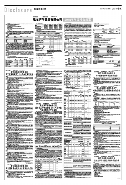 《歌尔声学股份有限公司2015年度报告摘要》详见信息披露网站巨潮资讯网http://www.cninfo.com.cn、证券时报、中国证券报、上海证券报。