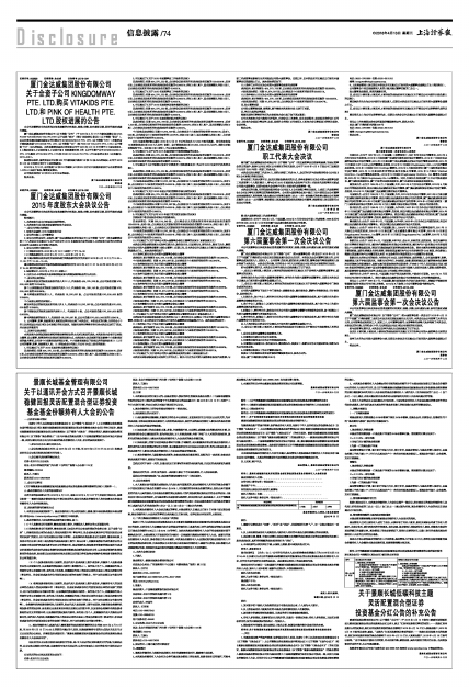 厦门金达威集团股份有限公司(以下简称“公司”)于2016年2月17日与新加坡籍公民ONE PANG TIAN和FOO YEE PHANT(以下合称“卖方”)签订《股权转让协议》(以下简称“协议”),以自有资金通过在新加坡设立的全资公司KINGDOMWAY PTE. LTD.(以下简称“KPL”)分数次合计购买新加坡VITAKIDS PTE. LTD.(以下简称“VK”)和PINK OF HEALTH PTE. LTD.(以下简称“PH”)95%的股权。本次投资事项具体内容详见公司于2016年2月18日刊登于《中国证券报》、《上海证券报》、《证券时报》、《证券日报》和巨潮资讯网上的《关于全资子公司KINGDOMWAY PTE. LTD.购买VITAKIDS PTE. LTD.和PINK OF HEALTH PTE. LTD.股权的公告》(公告编号:2016-009)。