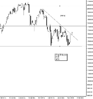 日经指数走势图表上的第二个形态特征是下降趋势线。这条线从2015年12月位于20012点附近的高点开始。2016年4月以及6月连续出现的高点确认了趋势线的位置。位于16497点的收盘价位于下降趋势线以上,这是下降趋势结束的第一个信号。在周线图表上指数最近收盘于16627点,这也确认了这一点。这是一个看多的特征。